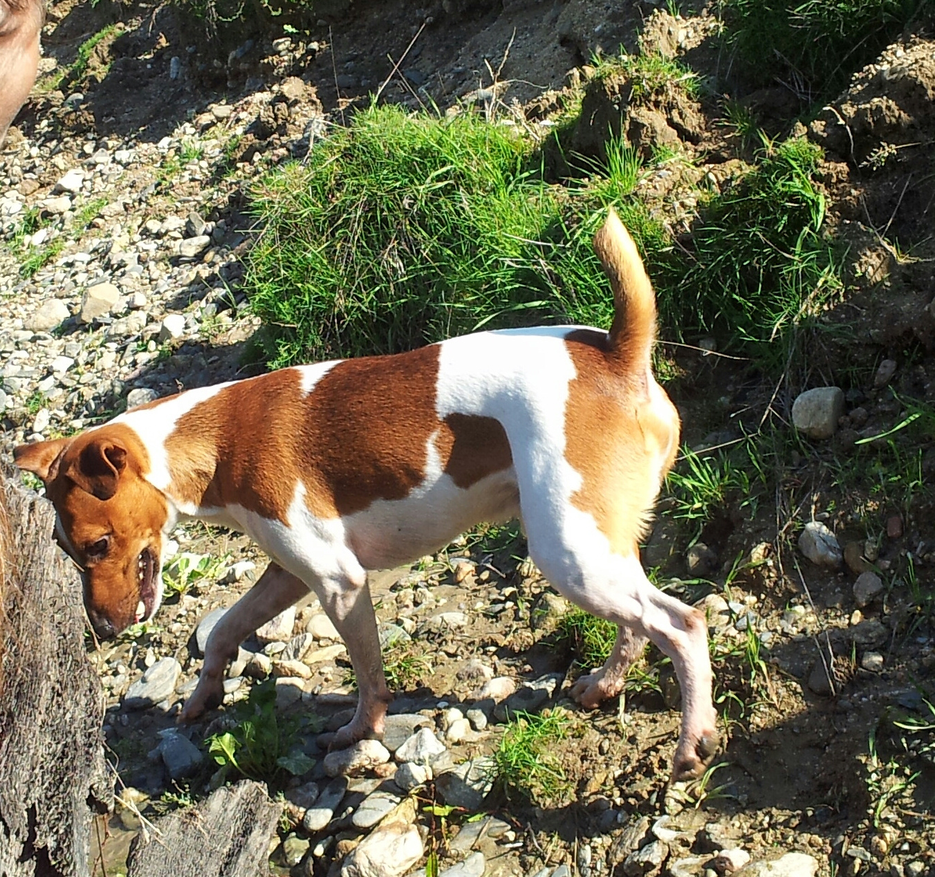 Тригодишн мъжки Джак ръсел, с бяла и кафява окраска. Има стар белег на задния десен крак и куца. Има зелен нагръдник със светлоотразителна лента.